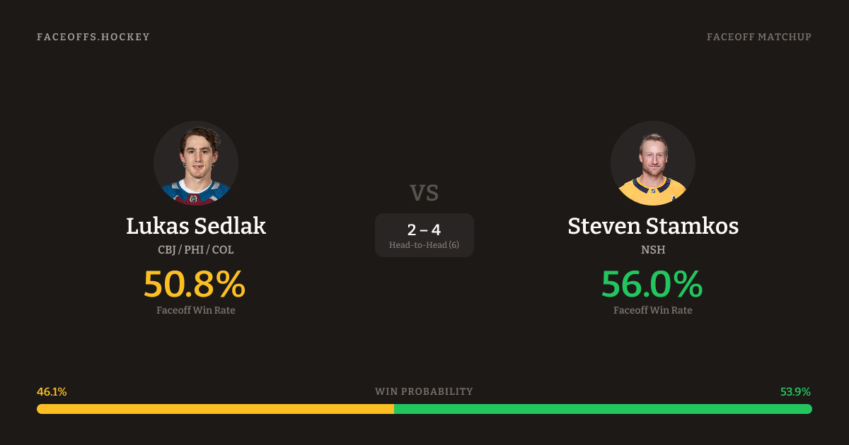 Steven Stamkos holds a +7.5% FO% edge overall. Look for Stamkos on defensive-zone draws (100% H2H, 3 meetings). Sedlak wins 42.0% vs right-shot opponents — Stamkos shoots right.