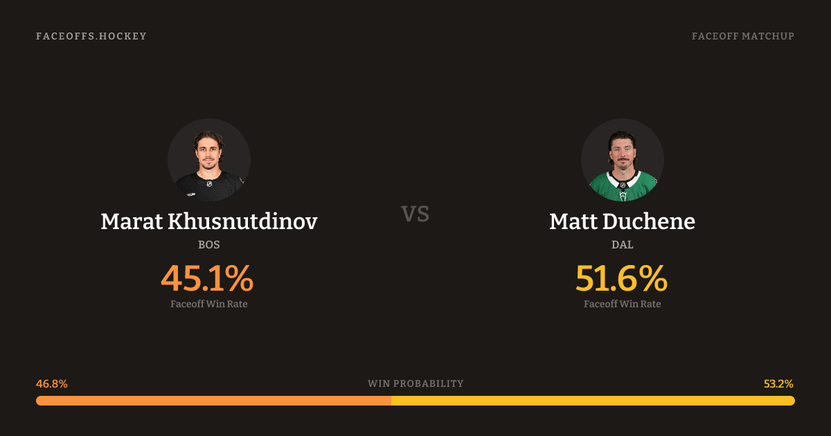 Matt Duchene holds a +8.8% FO% edge overall. Look for Duchene on neutral-zone draws (100% H2H, 3 meetings). Khusnutdinov wins 44.1% vs left-shot opponents — Duchene shoots left.