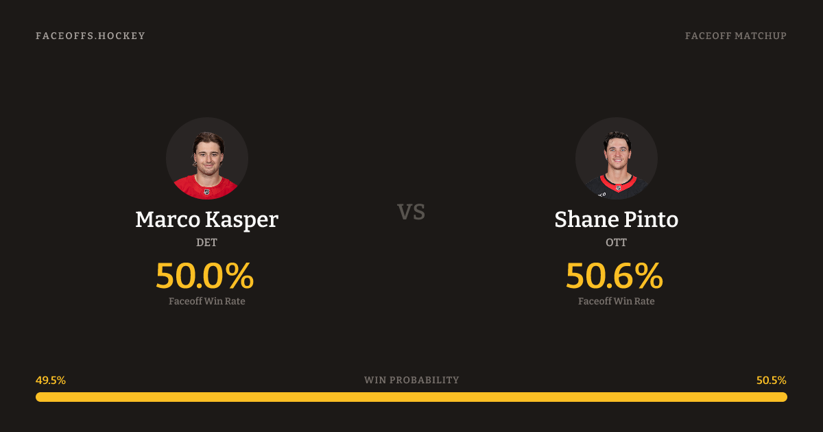 Shane Pinto holds a +5.2% FO% edge overall. Look for Kasper on offensive-zone draws (100% H2H, 6 meetings).