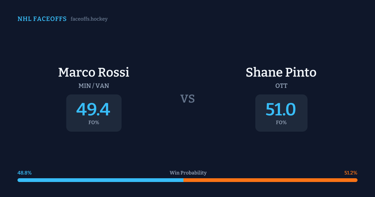 Shane Pinto holds a +3.3% FO% edge overall. Look for Rossi on offensive-zone draws (80% H2H, 5 meetings). Rossi wins 46.7% vs right-shot opponents — Pinto shoots right.