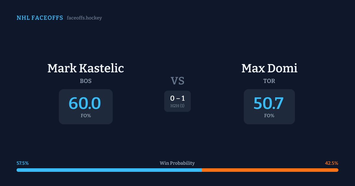 Mark Kastelic holds a +4.2% FO% edge overall. Look for Domi on neutral-zone draws (67% H2H, 3 meetings).