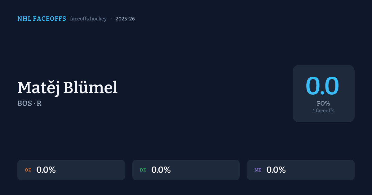 Matěj Blümel has a 2025-26 faceoff win percentage of 0.0% across 1 faceoffs in the 2025-26 season. Best zone: Neutral (0.0%).