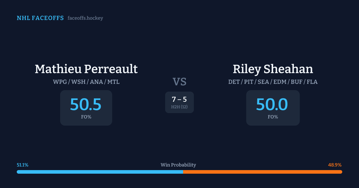 Mathieu Perreault holds a +1.7% FO% edge overall. Look for Perreault on defensive-zone draws (60% H2H, 5 meetings). Perreault wins 54.9% vs left-shot opponents — Sheahan shoots left.