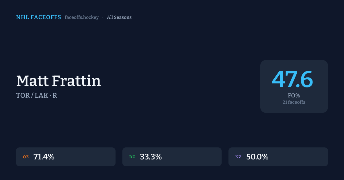 Matt Frattin has a career faceoff win percentage of 47.6% across 21 faceoffs. Best zone: Offensive (71.4%).