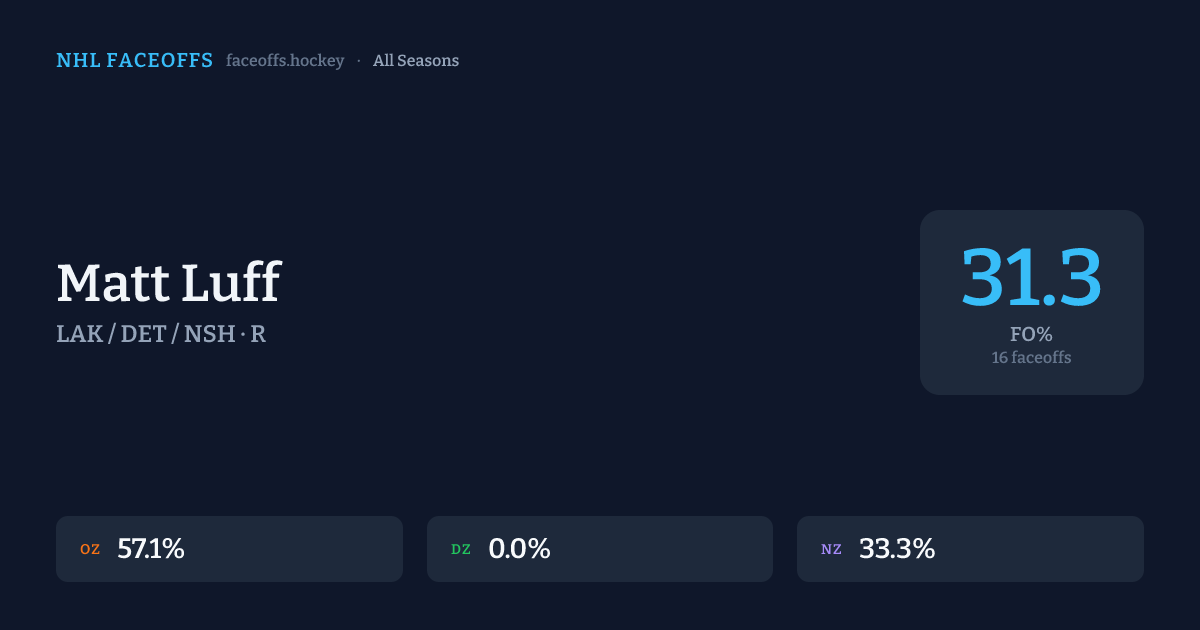Matt Luff has a 2022-23 faceoff win percentage of 0.0% across 2 faceoffs in the 2022-23 season. Best zone: Neutral (0.0%).