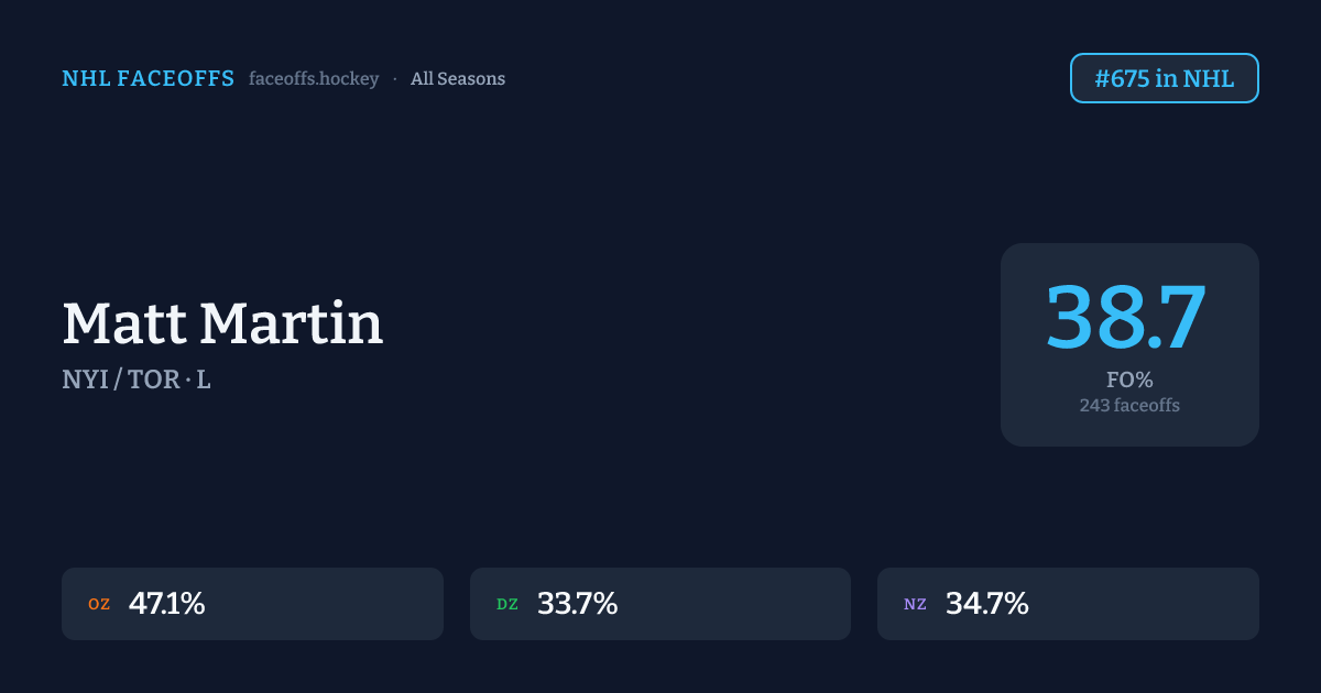Matt Martin has a career faceoff win percentage of 38.7% across 243 faceoffs. Best zone: Offensive (47.1%). Ranked #675 in the league.