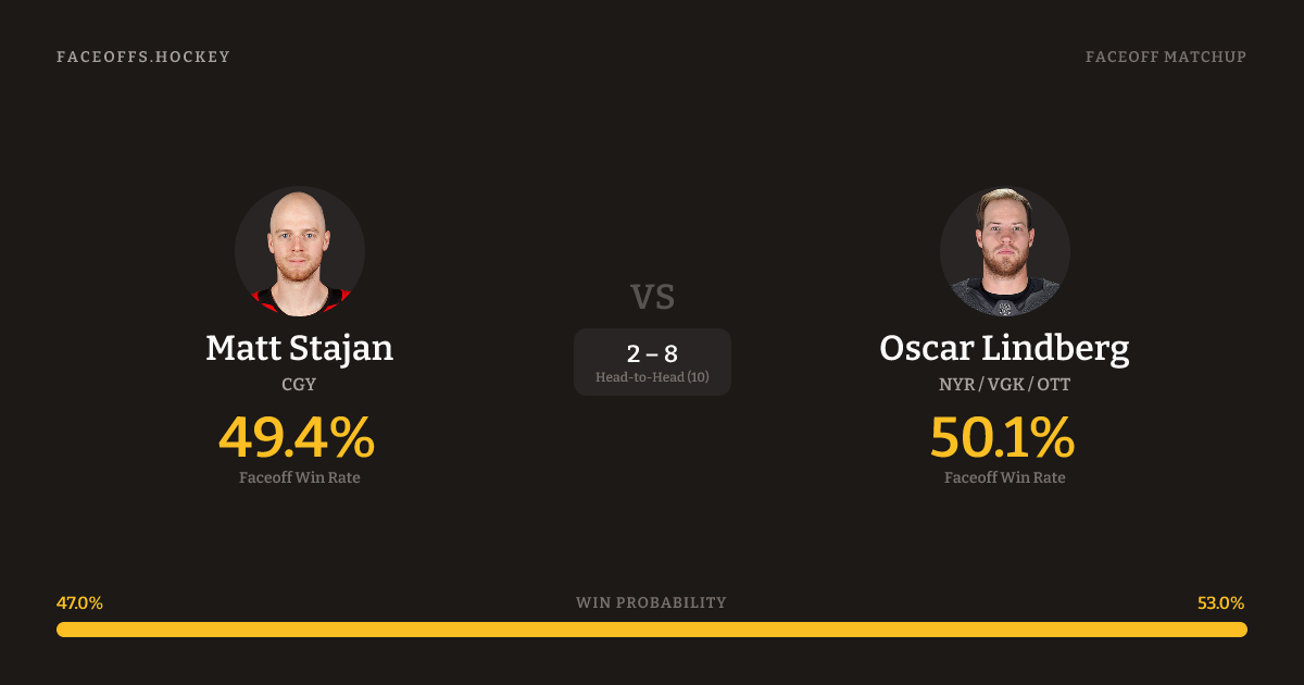 Oscar Lindberg holds a +1.4% FO% edge overall. Look for Lindberg on neutral-zone draws (67% H2H, 3 meetings).