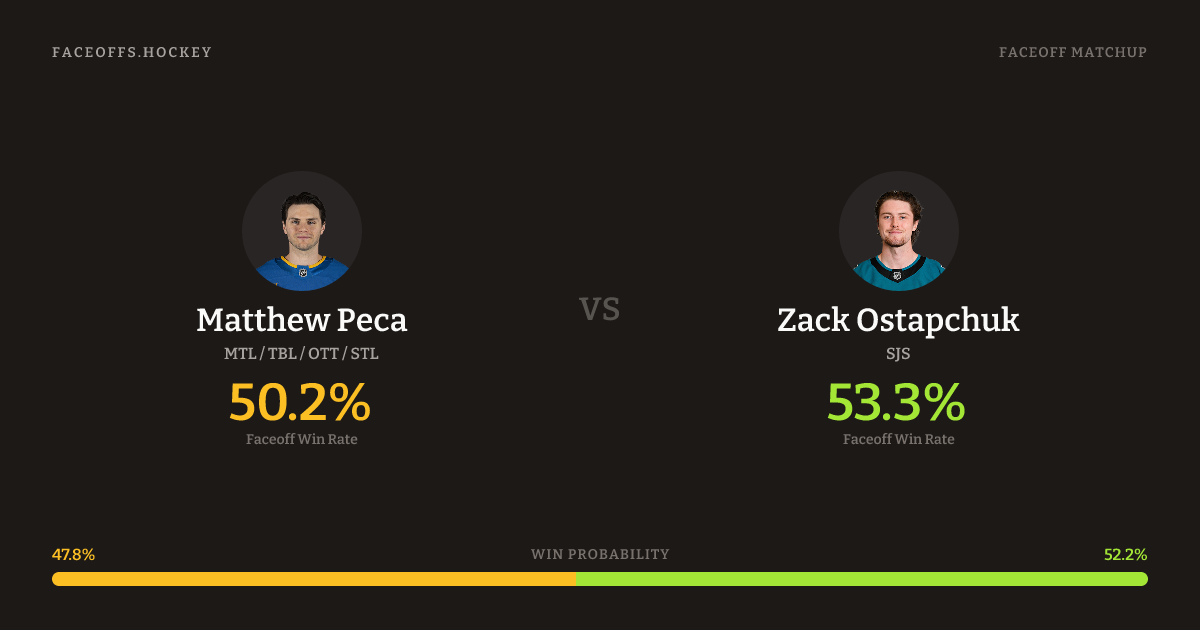 Matthew Peca holds a +1.1% FO% edge overall. Peca wins 46.4% vs left-shot opponents — Ostapchuk shoots left.