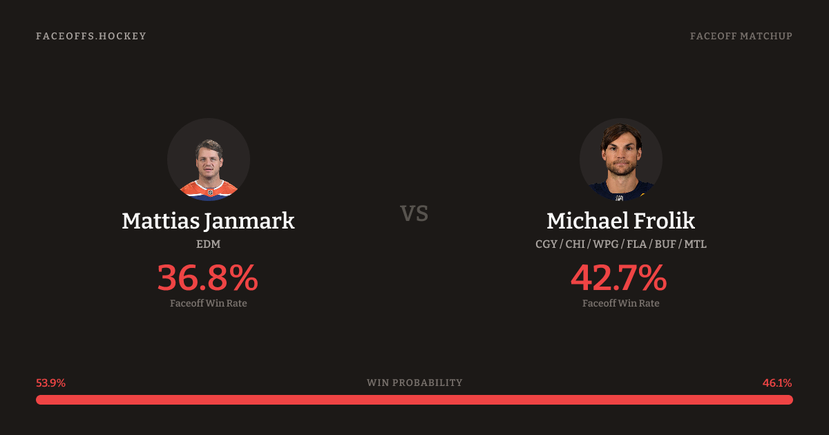 Michael Frolik holds a +3.5% FO% edge overall. Janmark wins 38.9% vs left-shot opponents — Frolik shoots left.