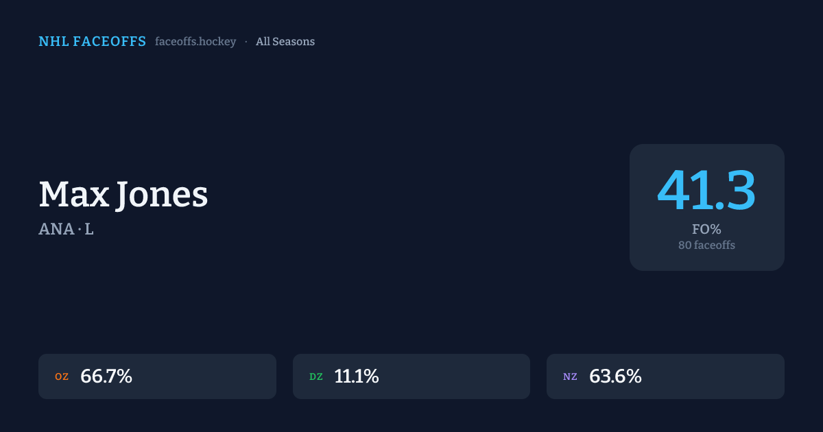 | 2023-24 | Anaheim Ducks | 14 | 31.3% | 5 | 16 | 75.0% | 11.1% | 33.3% |