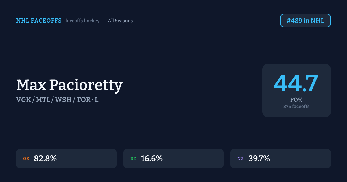 Max Pacioretty has a career faceoff win percentage of 44.7% across 376 faceoffs. Best zone: Offensive (82.8%). Ranked #489 in the league.