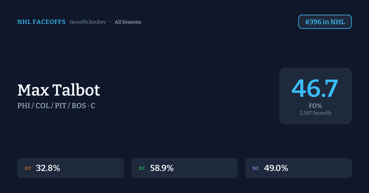 Max Talbot has a career faceoff win percentage of 46.7% across 2,587 faceoffs. Best zone: Defensive (58.9%). Ranked #396 in the league.