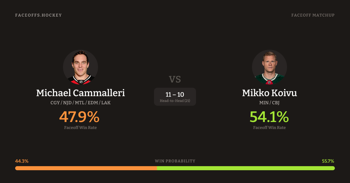 Mikko Koivu holds a +6.2% FO% edge overall. Look for Cammalleri on offensive-zone draws (56% H2H, 9 meetings). Cammalleri wins 46.7% vs left-shot opponents — Koivu shoots left.