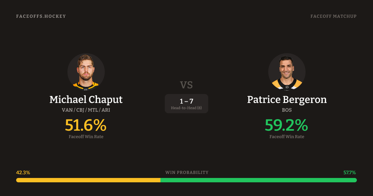 Chaput shoots left. Bergeron is 59.9% vs left-shot opponents (1,119).