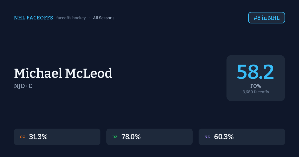 Michael McLeod has a 2022-23 faceoff win percentage of 60.1% across 1,128 faceoffs in the 2022-23 season. Best zone: Defensive (78.2%). Ranked #4 in the league.