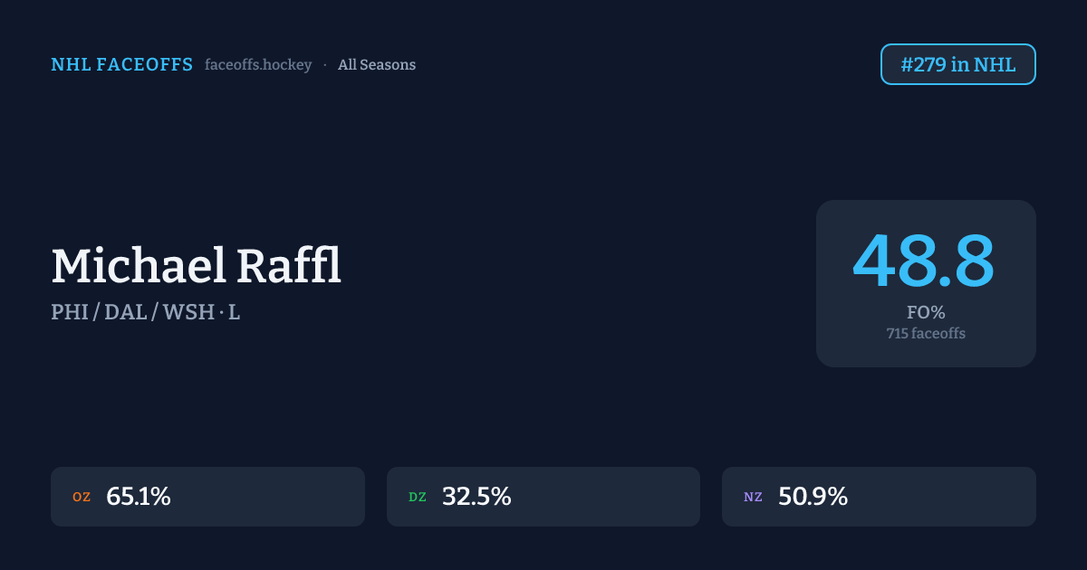 Michael Raffl has a career faceoff win percentage of 48.8% across 715 faceoffs. Best zone: Offensive (65.1%). Ranked #279 in the league.