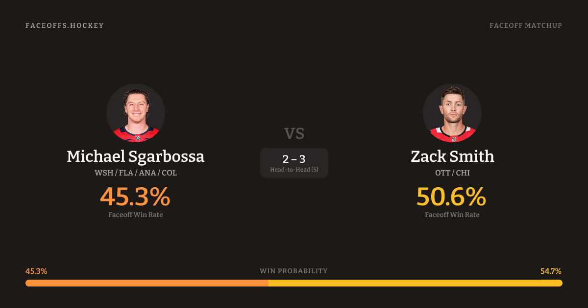 Zack Smith holds a +8.2% FO% edge overall. Look for Smith on offensive-zone draws (67% H2H, 3 meetings).