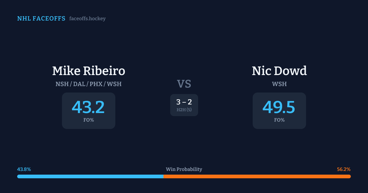 Nic Dowd holds a +6.6% FO% edge overall. Look for Ribeiro on neutral-zone draws (67% H2H, 3 meetings). Ribeiro wins 42.9% vs right-shot opponents — Dowd shoots right.