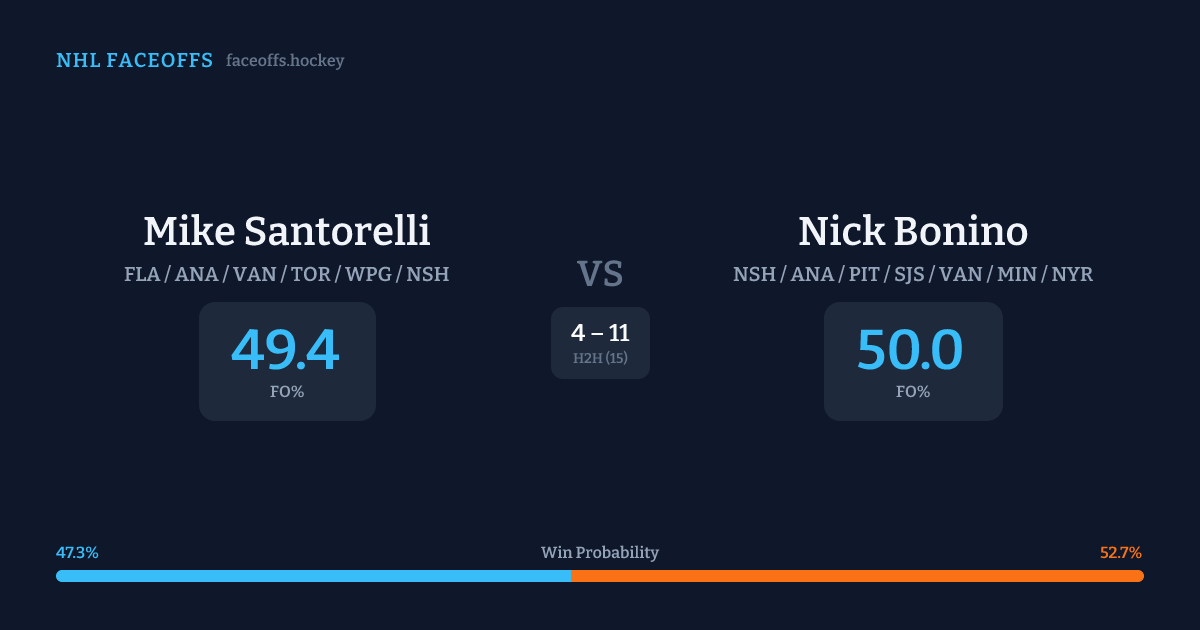 Mike Santorelli holds a +2.5% FO% edge overall. Look for Bonino on neutral-zone draws (86% H2H, 7 meetings).