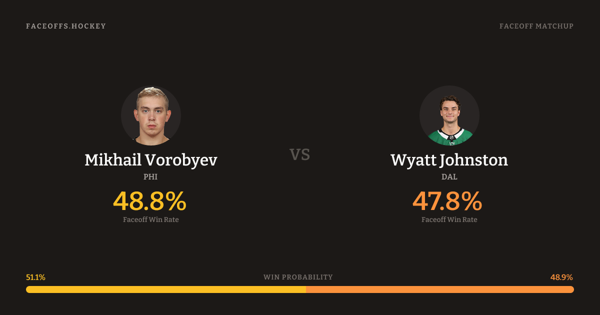 These two are closely matched in overall FO% (48.8% vs 49.1%). Vorobyev wins 59.7% vs right-shot opponents — Johnston shoots right.