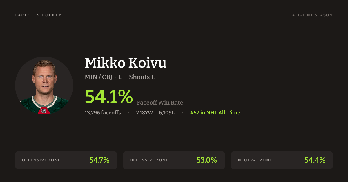 Mikko Koivu has a career faceoff win percentage of 54.2% across 14,354 faceoffs. Best zone: Offensive (55.1%). Ranked #55 in the league.