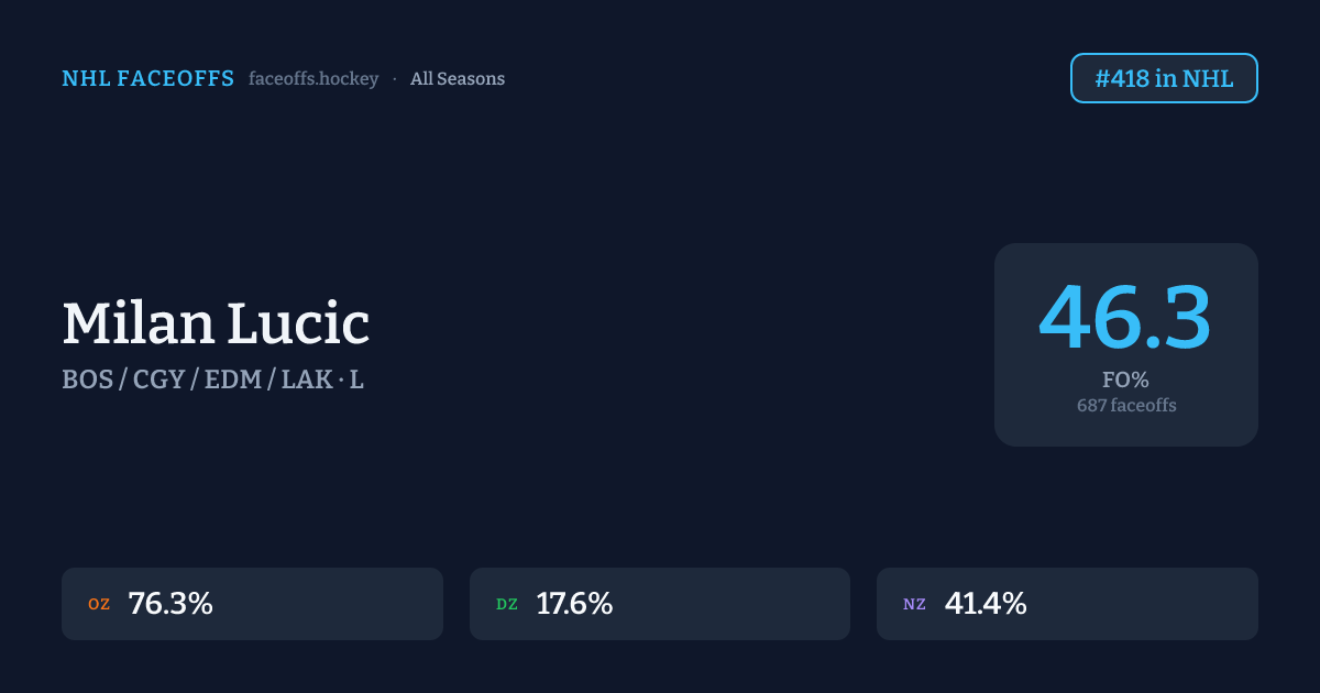 Milan Lucic has a career faceoff win percentage of 46.3% across 687 faceoffs. Best zone: Offensive (76.3%). Ranked #418 in the league.