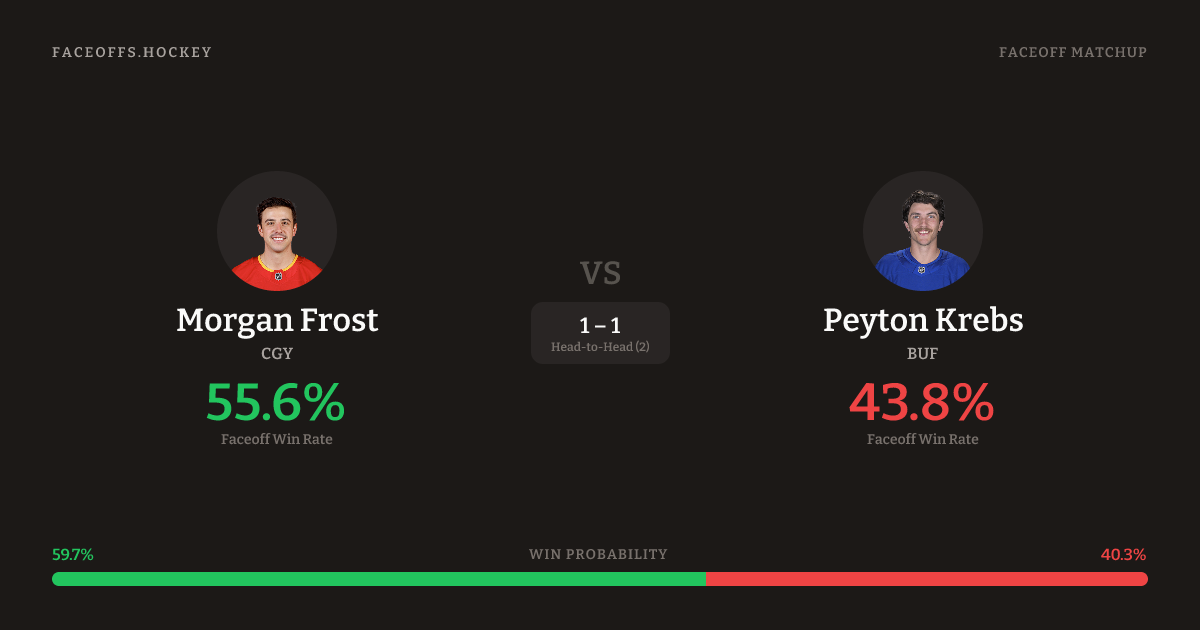 Morgan Frost holds a +13.1% FO% edge overall. Look for Frost on neutral-zone draws (100% H2H, 3 meetings).