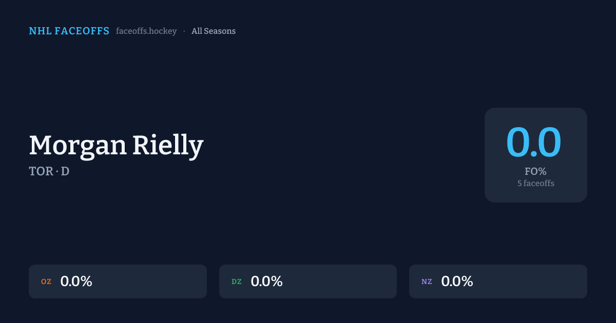 Morgan Rielly has a career faceoff win percentage of 0.0% across 5 faceoffs. Best zone: Neutral (0.0%).