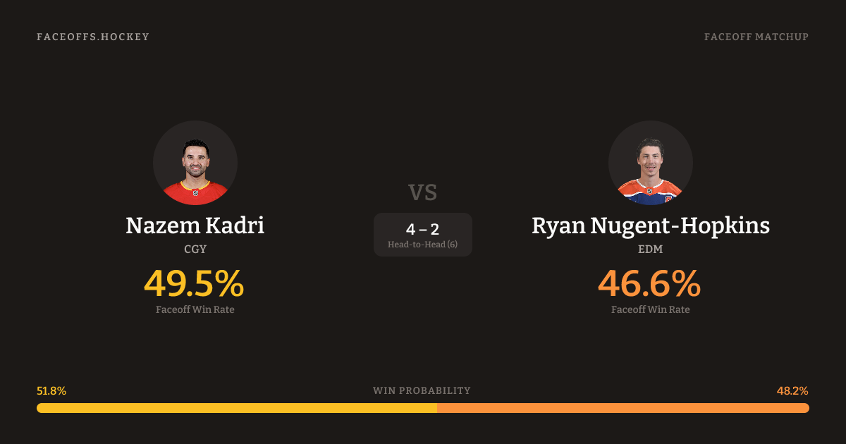 Nazem Kadri holds a +2.9% FO% edge overall. Look for Kadri on offensive-zone draws (67% H2H, 3 meetings). Kadri wins 45.8% vs left-shot opponents — Nugent-Hopkins shoots left.