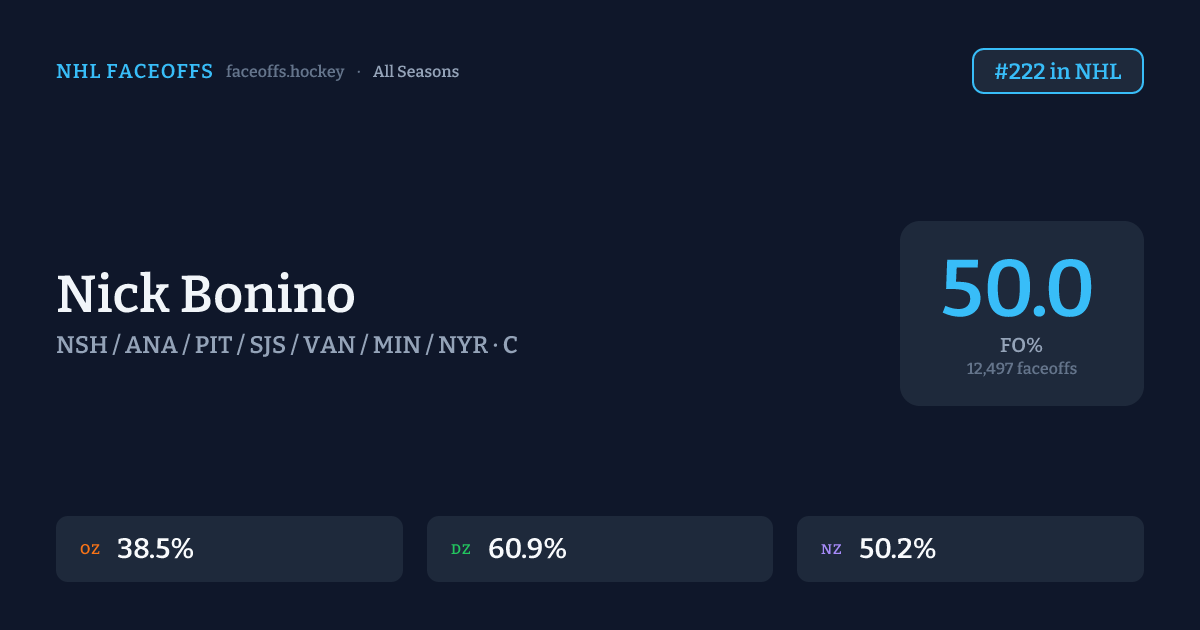 Nick Bonino has a career faceoff win percentage of 50.0% across 12,497 faceoffs. Best zone: Defensive (60.9%). Ranked #222 in the league.