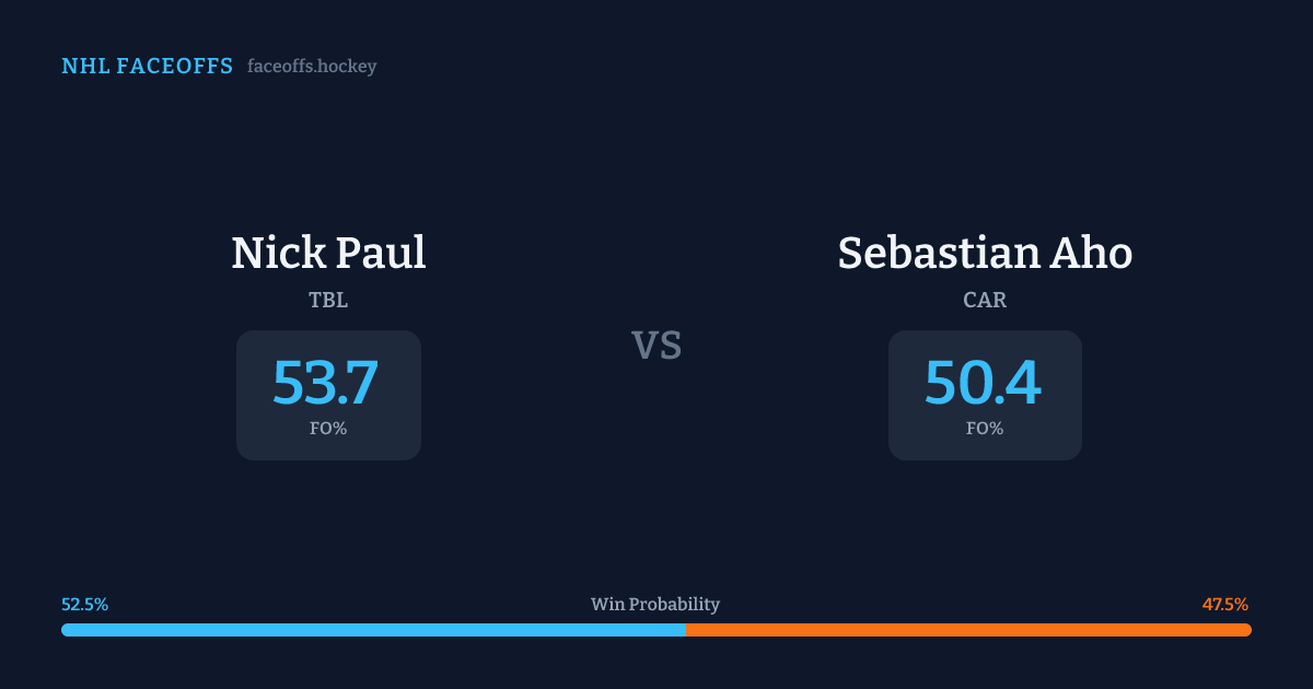 Sebastian Aho holds a +2.0% FO% edge overall. Look for Paul on defensive-zone draws (100% H2H, 7 meetings). Paul wins 53.2% vs left-shot opponents — Aho shoots left.