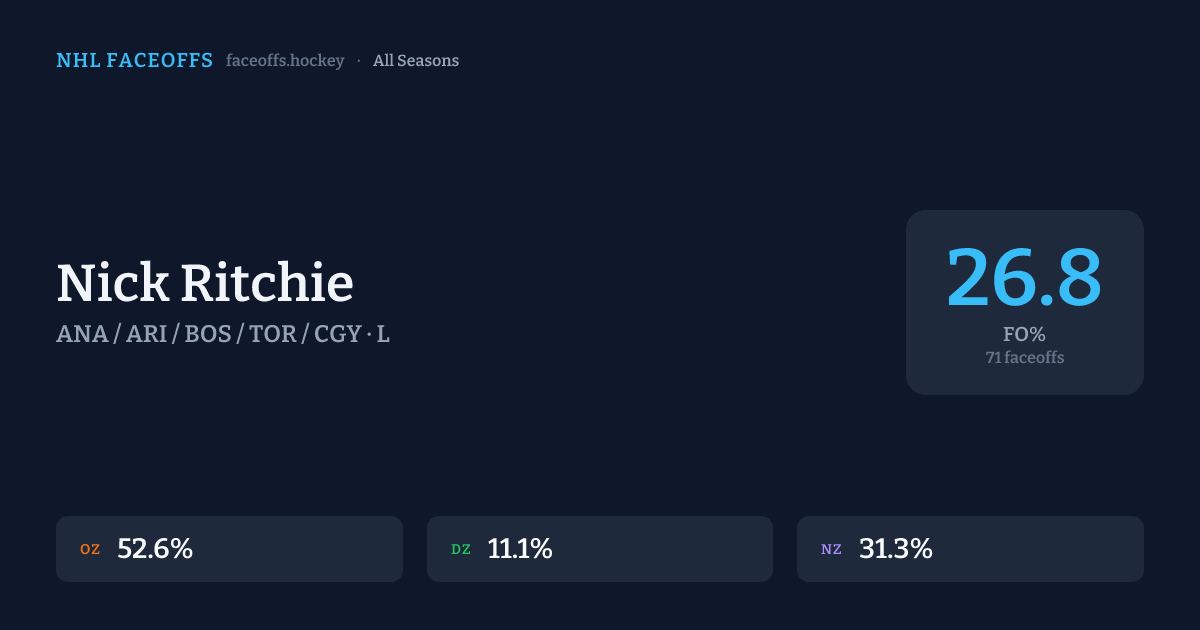 Nick Ritchie has a 2017-18 faceoff win percentage of 35.3% across 17 faceoffs in the 2017-18 season. Best zone: Neutral (60.0%).