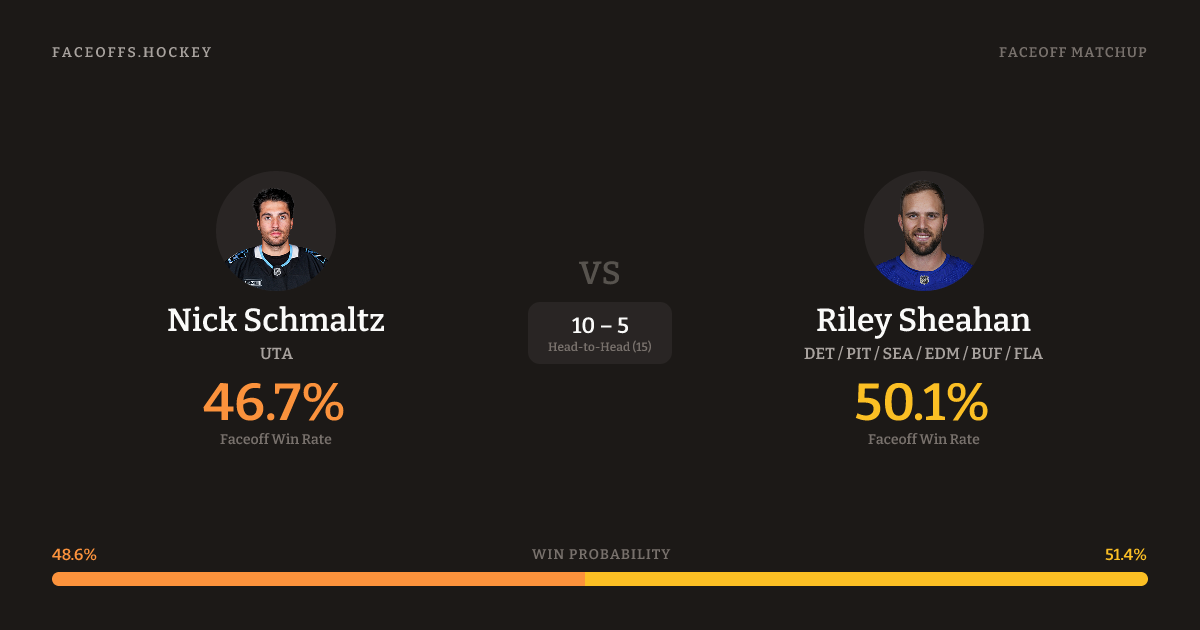 Riley Sheahan holds a +6.4% FO% edge overall. Look for Schmaltz on neutral-zone draws (67% H2H, 6 meetings). Schmaltz wins 43.8% vs left-shot opponents — Sheahan shoots left.