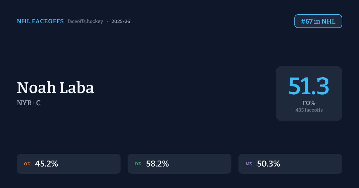 Noah Laba has a 2025-26 faceoff win percentage of 51.3% across 435 faceoffs in the 2025-26 season. Best zone: Defensive (58.2%). Ranked #67 in the league.