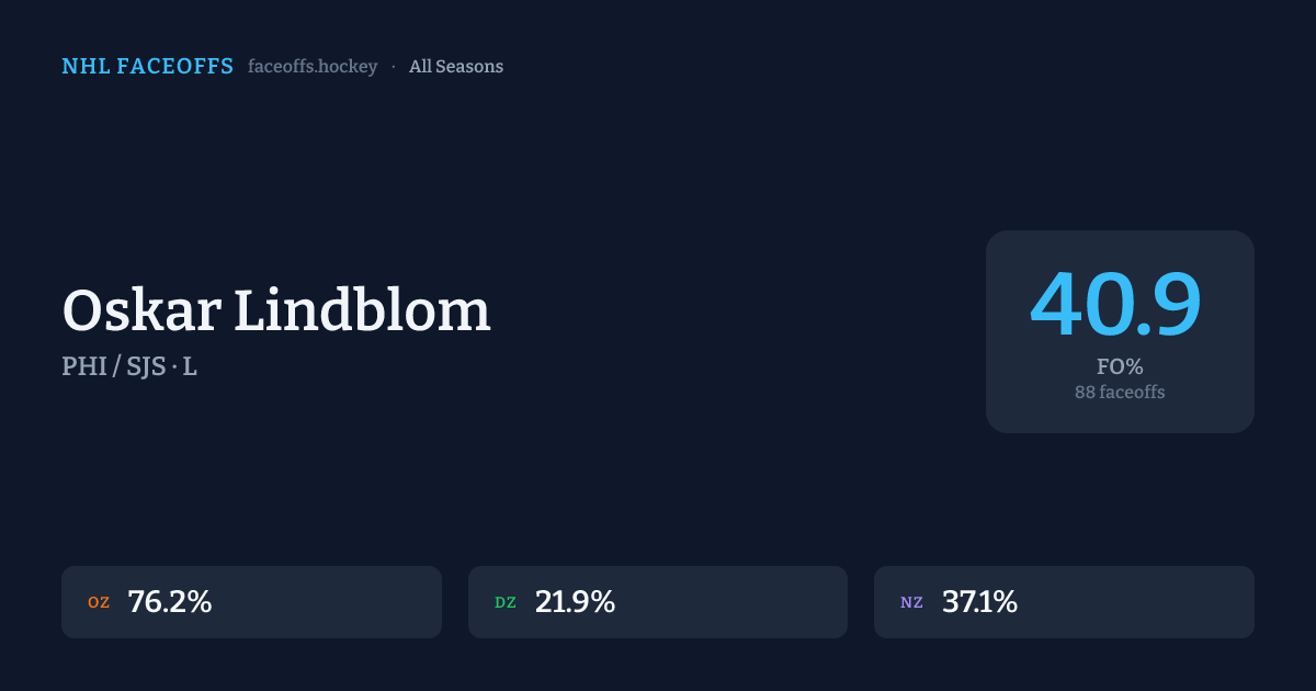 Oskar Lindblom has a career faceoff win percentage of 40.9% across 88 faceoffs. Best zone: Offensive (76.2%).
