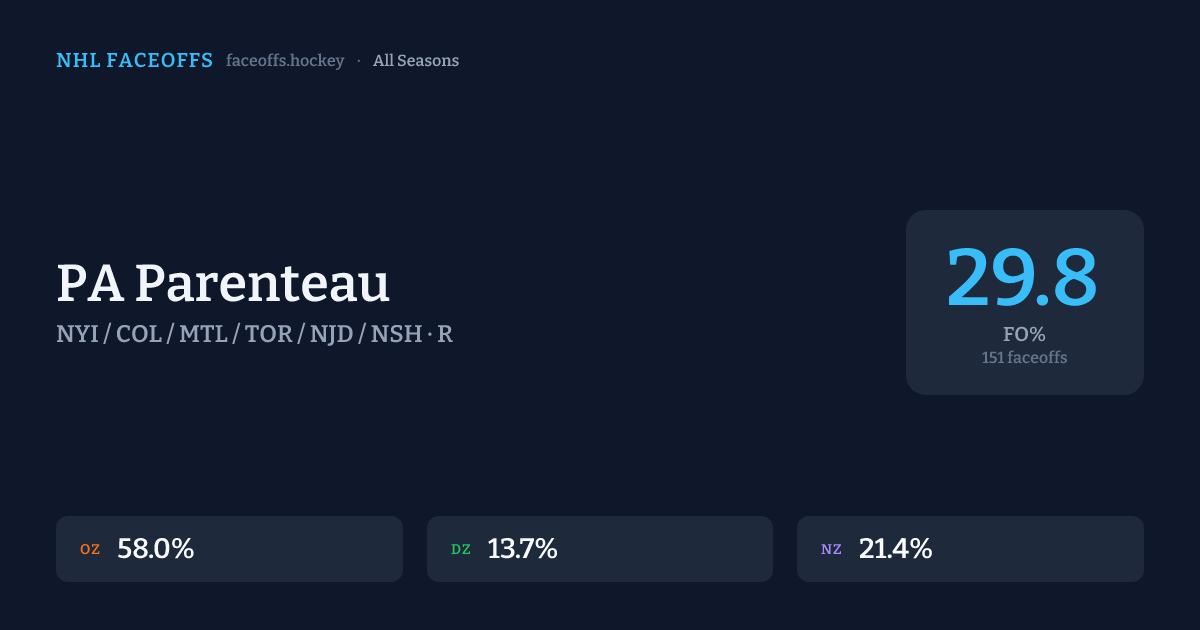 PA Parenteau has a career faceoff win percentage of 29.8% across 151 faceoffs. Best zone: Offensive (58.0%).