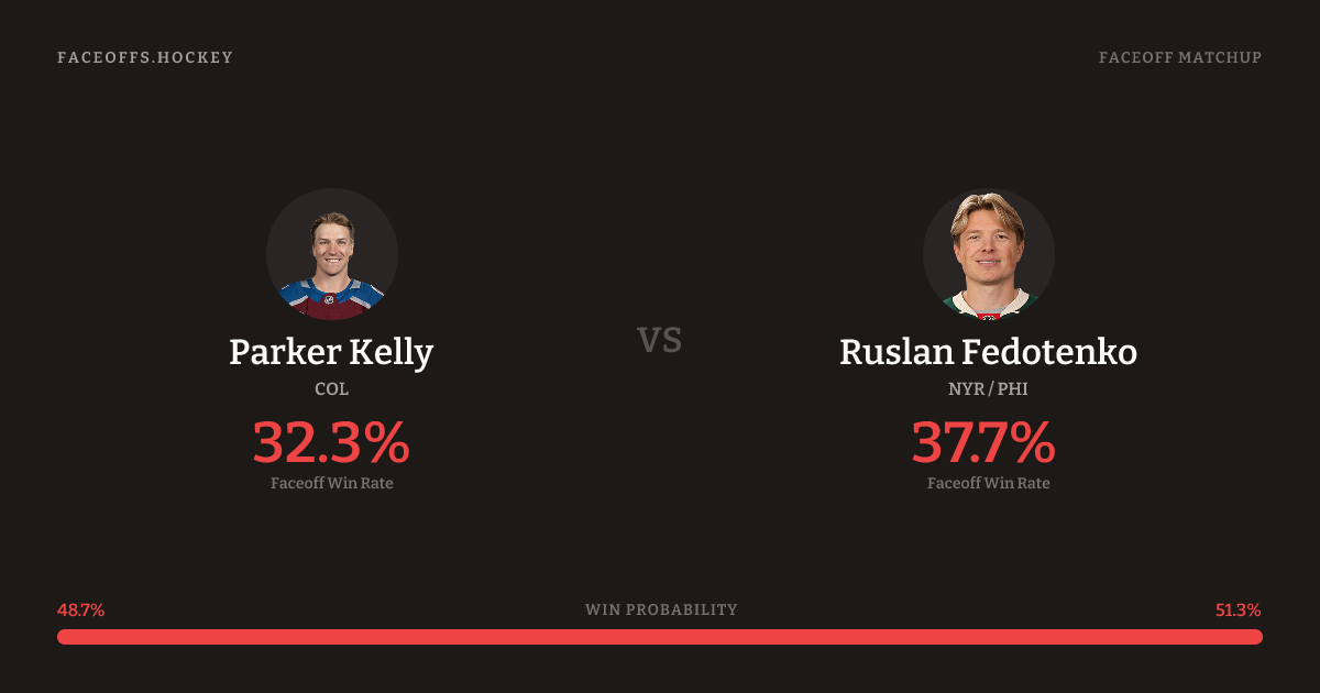 Parker Kelly holds a +2.7% FO% edge overall. Kelly wins 41.3% vs left-shot opponents — Fedotenko shoots left.