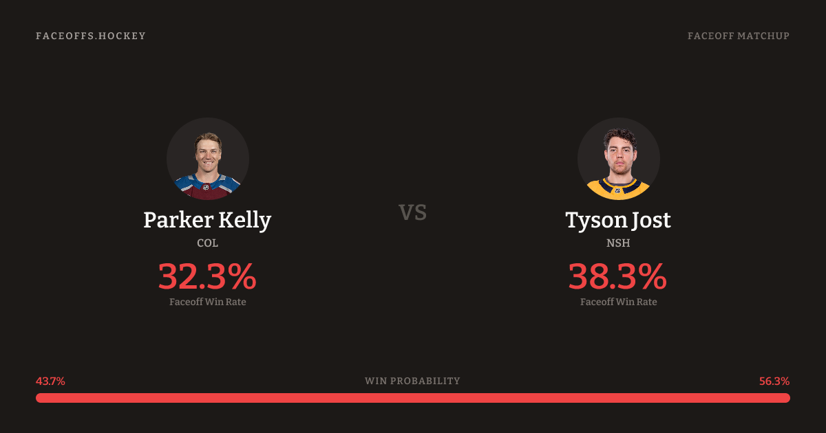Tyson Jost holds a +6.0% FO% edge overall. Kelly wins 34.6% vs left-shot opponents — Jost shoots left.