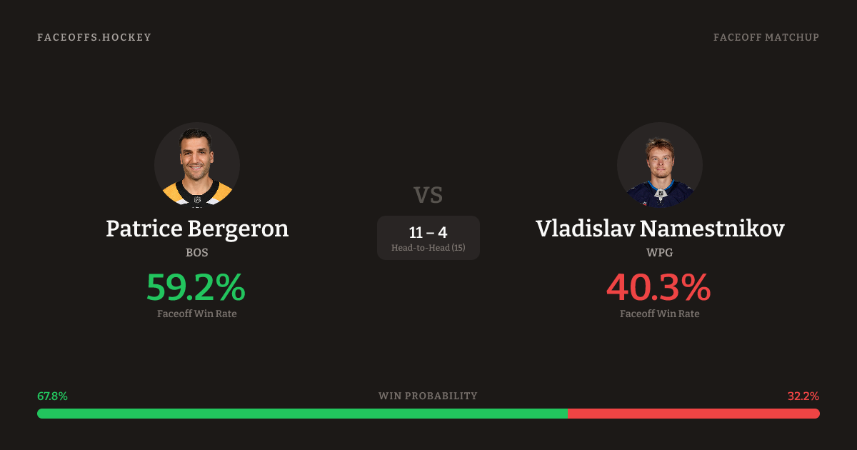 Patrice Bergeron holds a +16.6% FO% edge overall. Look for Bergeron on defensive-zone draws (100% H2H, 4 meetings). Bergeron wins 62.3% vs left-shot opponents — Namestnikov shoots left.