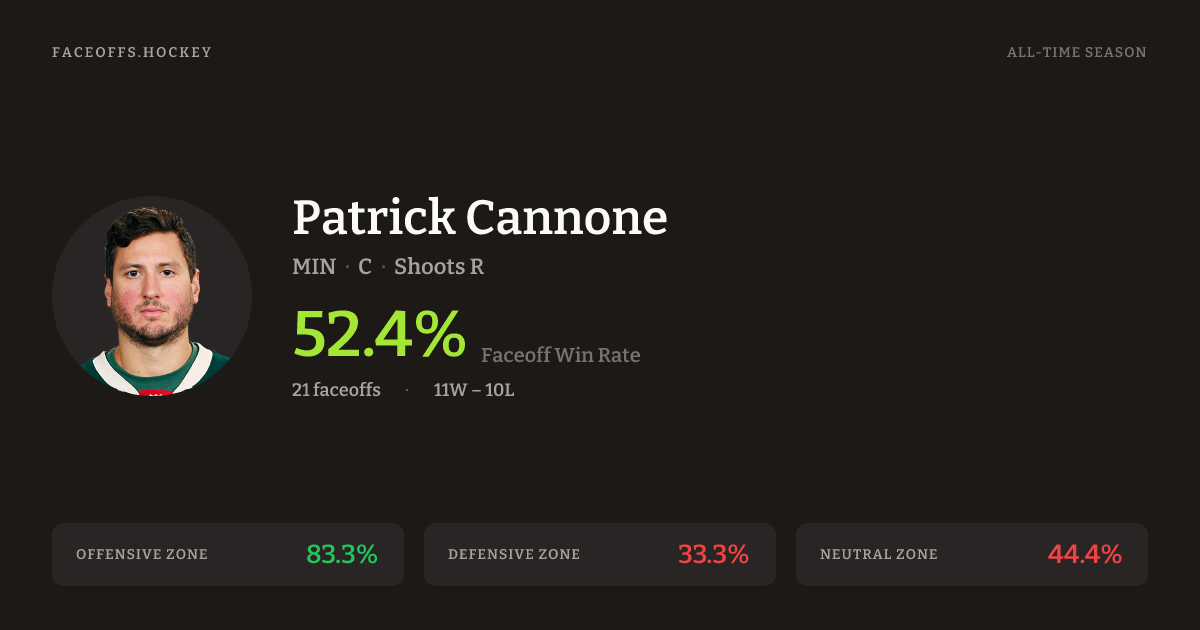 Patrick Cannone has a career faceoff win percentage of 52.4% across 21 faceoffs. Best zone: Offensive (83.3%).