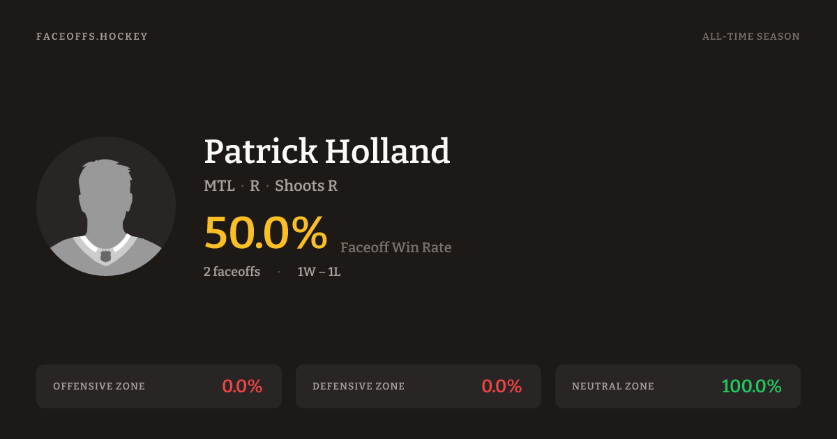 Patrick Holland has a career faceoff win percentage of 50.0% across 2 faceoffs. Best zone: Neutral (100.0%).