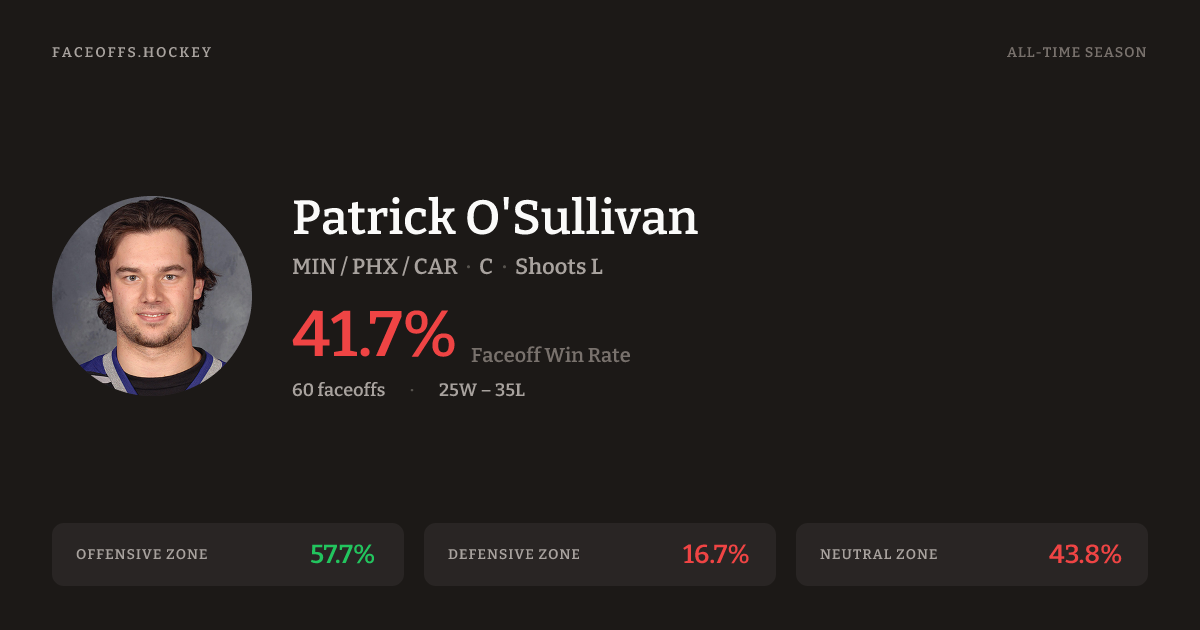 Patrick O'Sullivan has a career faceoff win percentage of 41.7% across 60 faceoffs. Best zone: Offensive (57.7%).