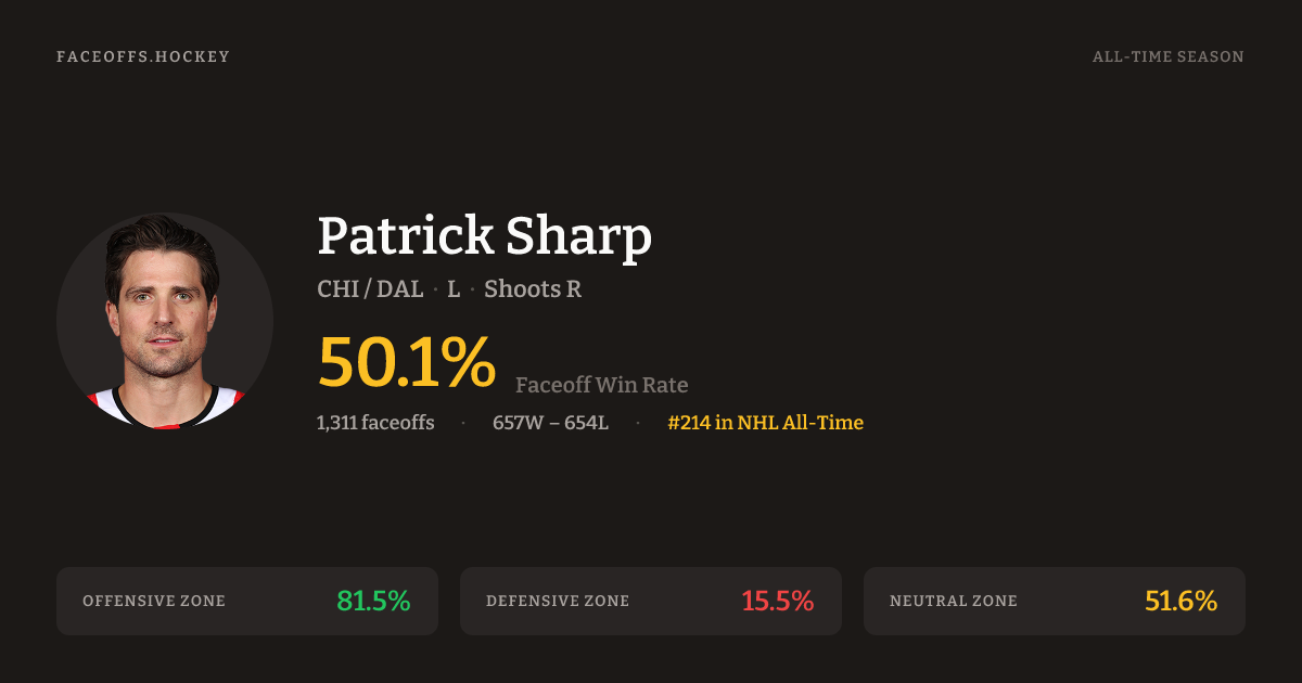 Patrick Sharp has a career faceoff win percentage of 50.1% across 1,510 faceoffs. Best zone: Offensive (81.8%). Ranked #211 in the league.