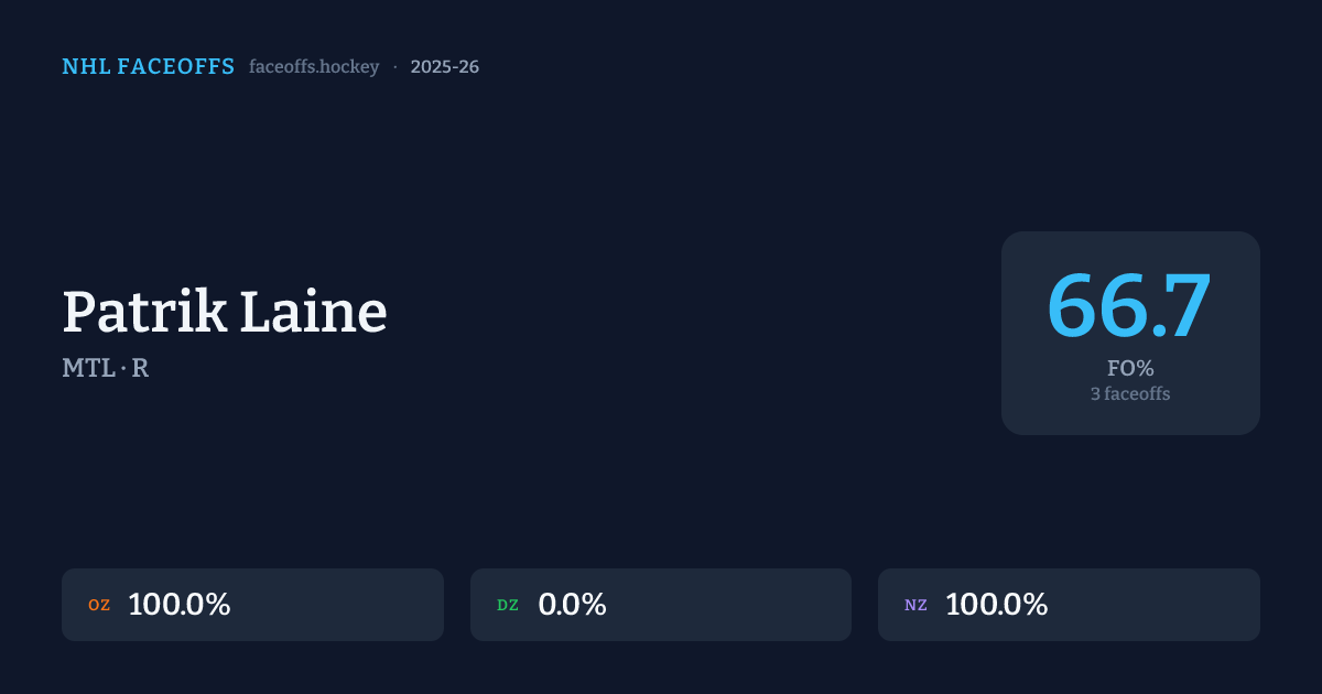 Patrik Laine has a 2025-26 faceoff win percentage of 66.7% across 3 faceoffs in the 2025-26 season. Best zone: Neutral (100.0%).