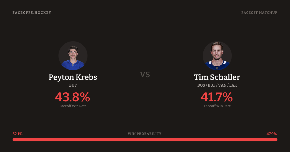 Peyton Krebs holds a +4.0% FO% edge overall. Krebs wins 44.0% vs left-shot opponents — Schaller shoots left.