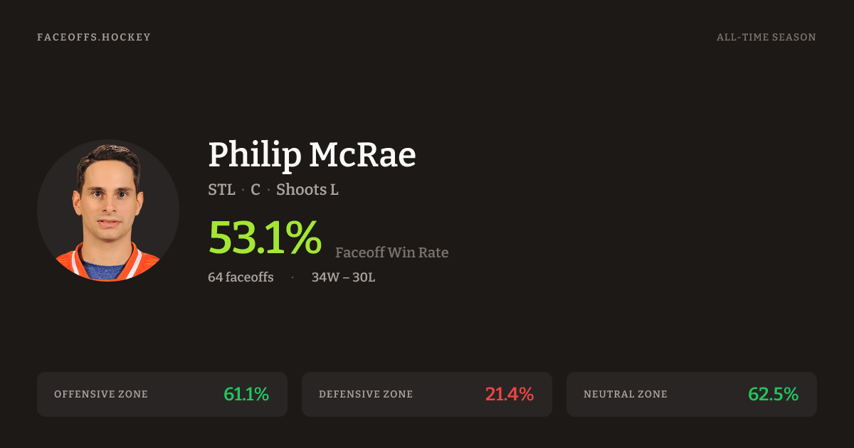 Philip McRae has a career faceoff win percentage of 53.1% across 64 faceoffs. Best zone: Neutral (62.5%).