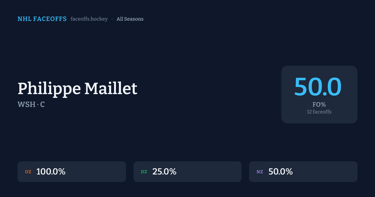 Philippe Maillet has a 2020-21 faceoff win percentage of 50.0% across 12 faceoffs in the 2020-21 season. Best zone: Offensive (100.0%).
