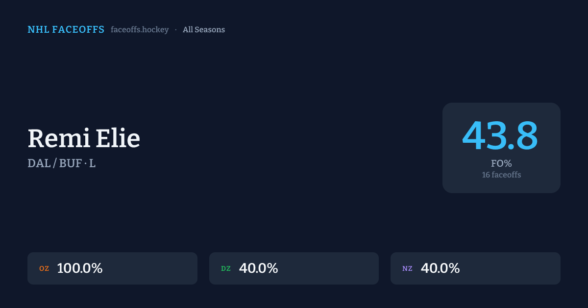 Remi Elie has a career faceoff win percentage of 43.8% across 16 faceoffs. Best zone: Offensive (100.0%).