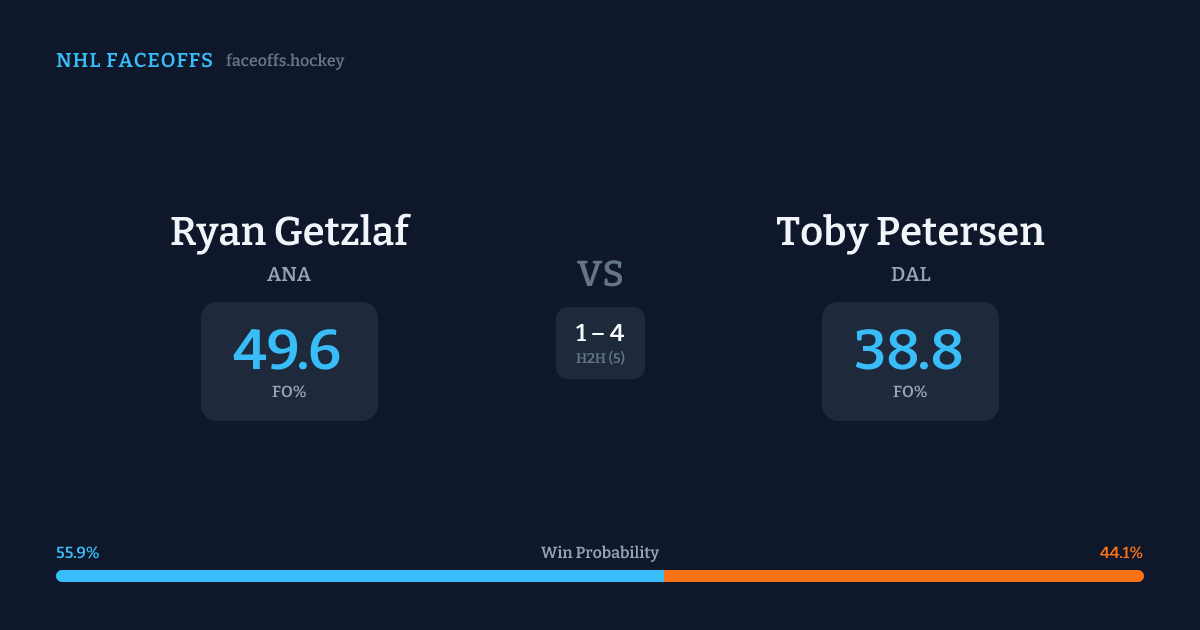 Ryan Getzlaf holds a +7.5% FO% edge overall. Getzlaf wins 44.3% vs left-shot opponents — Petersen shoots left.