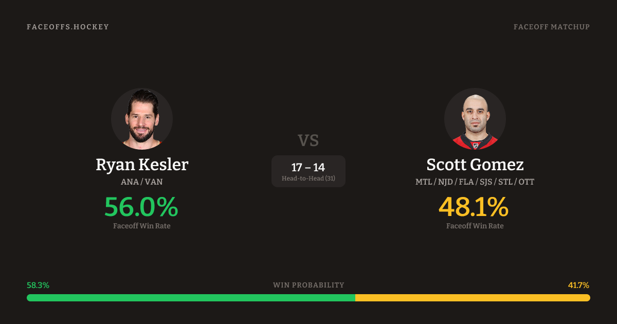 Ryan Kesler holds a +1.5% FO% edge overall. Kesler wins 58.9% vs left-shot opponents — Gomez shoots left.